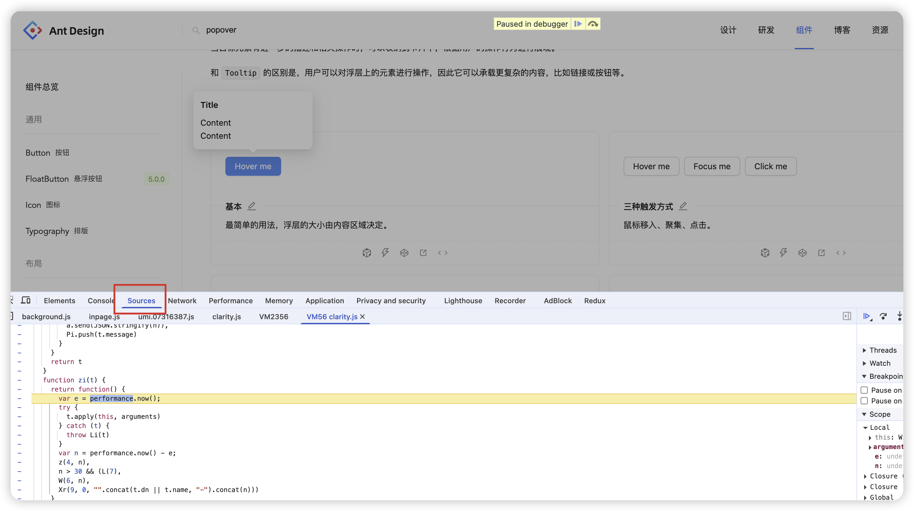 When debugging the style of components like Popover, it is difficult to locate the position of the pop-up box. If the pop-up box is expanded through js, you can pause the script execution through F8 to locate the position of the pop-up box.